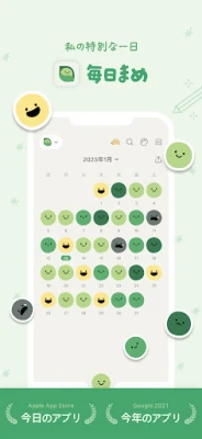 「毎日まめ」は、あなたの心の動きをそっと見守り、日々の感情を色鮮やかに映し出すパーソナルジャーナルです。五つの表情豊かな「気分まめ」が、一ヶ月の心の足跡を直感的にカレンダー上に描き出します。月の流れの中で、どの日にどんな気持ちで過ごしたのか、一目で振り返ることが可能。気になる日付のまめをタップすれば、その日の大切な記憶や記録に瞬時にアクセスできます。